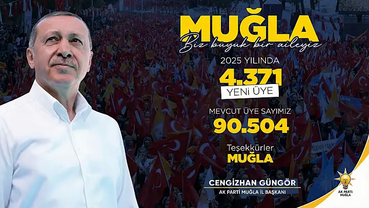 'AK Parti Muğla olarak 2025 yılında üye sayımızı 4.371 artırarak yıl sonunda toplam 90.504 üye sayısına ulaştık. Büyük ailemizin her geçen gün daha da büyümesinde emeği geçen tüm teşkilat mensuplarımıza gönülden teşekkür ediyor, AK Parti ailemize yeni katılan üyelerimize hoş geldiniz diyoruz.'