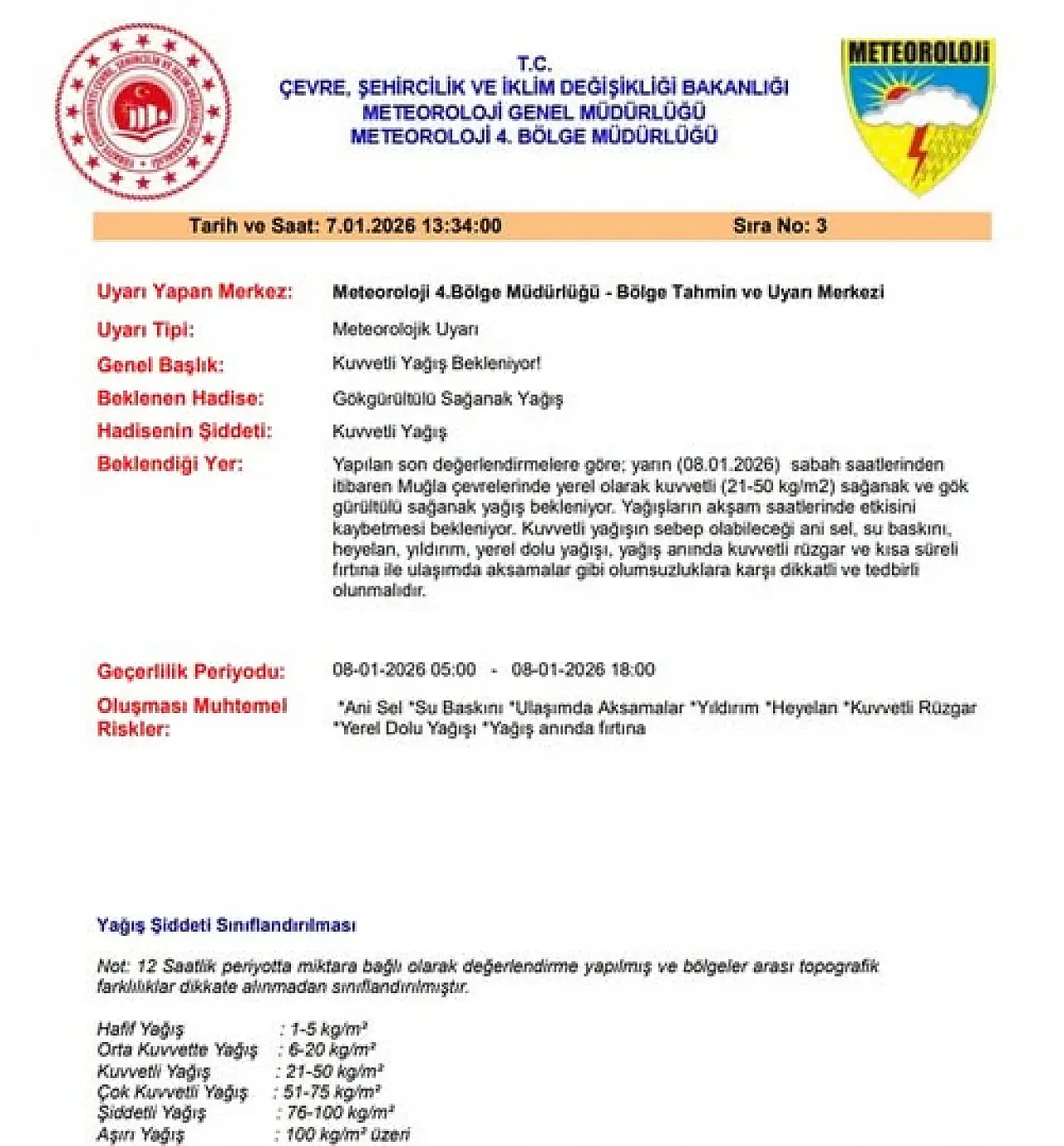 Yapılan son değerlendirmelere göre; yarın (08.01.2026) sabah saatlerinden itibaren Muğla çevrelerinde yerel olarak kuvvetli (21-50 kg/m2) sağanak ve gök gürültülü sağanak yağış bekleniyor.