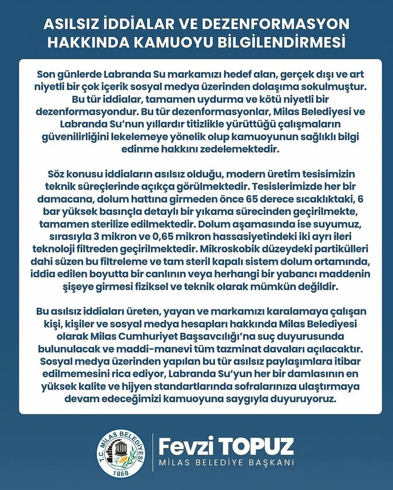 Açıklamada, bu tür paylaşımların Milas Belediyesi ve Labranda Su’nun uzun yıllardır titizlikle yürüttüğü çalışmaların güvenilirliğini zedelemeye yönelik olduğu vurgulandı. Belediyeden yapılan bilgilendirmede, kamuoyunun sağlıklı bilgi edinme hakkının bu tür içeriklerle zarar gördüğü belirtildi.