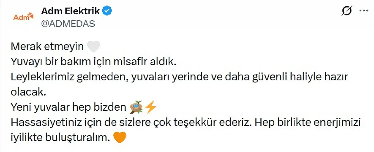 Şirketten "Merak Etmeyin" Cevabı Vatandaşın bu duyarlı çağrısı kısa sürede karşılık buldu. ADM Elektrik (@ADMEDAS) resmi hesabından yapılan açıklamada, yuvanın kaldırılmadığı, bakım için alındığı belirtildi. Şirket, şu ifadeleri kullandı: "Merak etmeyin. Yuvayı bir bakım için misafir aldık. Leyleklerimiz gelmeden, yuvaları yerinde ve daha güvenli haliyle hazır olacak. Yeni yuvalar hep bizden. Enerjimizi iyilikte buluşturalım."