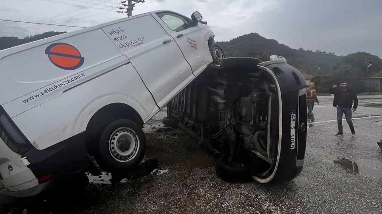 Muğla'nın Milas ilçesinde yağışlı havanın etkisiyle kontrolden çıkan bir ilaç dağıtım kamyoneti, kavşakta bekleyen okul servisine çarparak üzerine çıktı. Film sahnelerini aratmayan kazada, servisin yan yatması ve kamyonetin servisin üzerinde asılı kalması yürekleri ağza getirdi.
