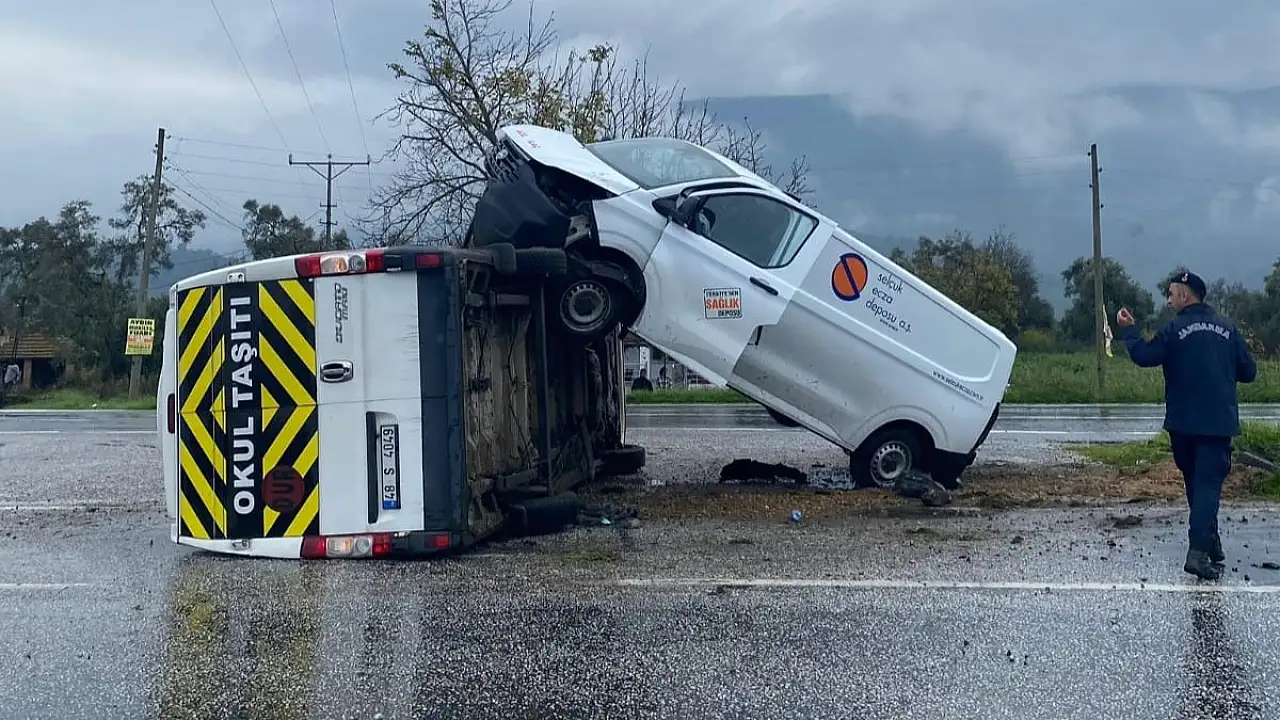 Milas'ta Yağışlı Havada Faciadan Dönüldü: Okul Taşıtı Yan Yattı, Kamyonet Üstüne Tırmandı 3 Kişi Yaralandı