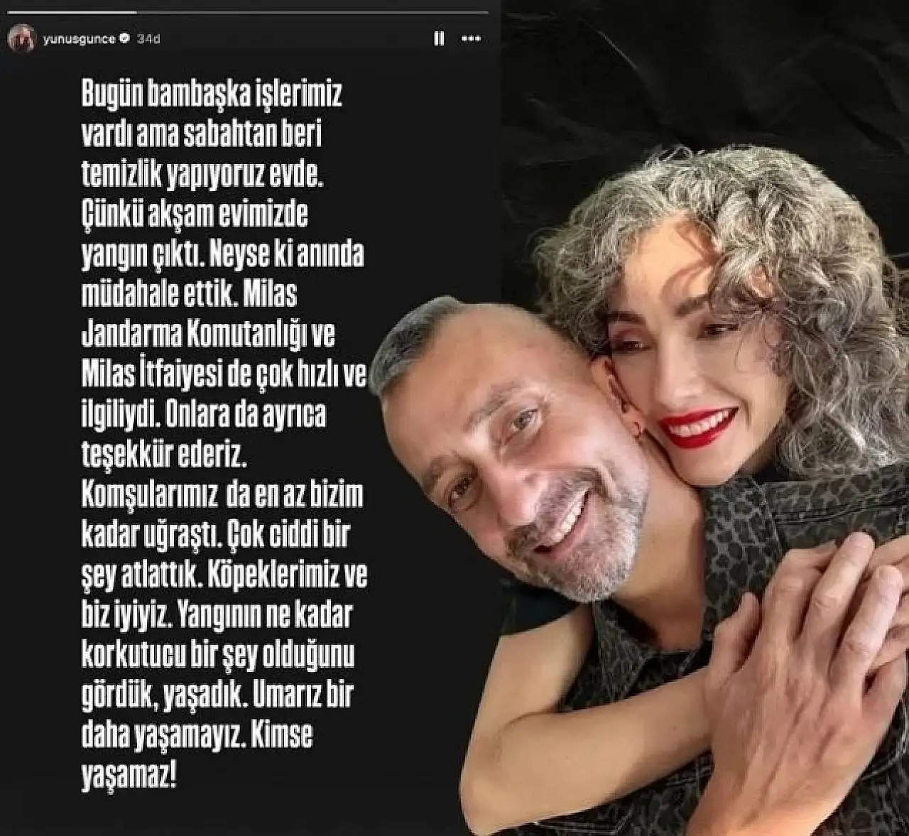 "Bugün bambaşka işlerimiz vardı ama sabahtan beri evde temizlik yapıyoruz. Çünkü akşam evimizde yangın çıktı. Neyse ki anında müdahale ettik. Milas Jandarma Komutanlığı ve Milas İtfaiyesi de çok hızlı ve ilgiliydi. Onlara ayrıca teşekkür ederiz. Komşularımız da en az bizim kadar uğraştı. Çok ciddi bir şey atlattık. Köpeklerimiz ve biz iyiyiz. Yangının ne kadar korkutucu olduğunu gördük, yaşadık. Umarız bir daha yaşamayız, kimse yaşamaz."